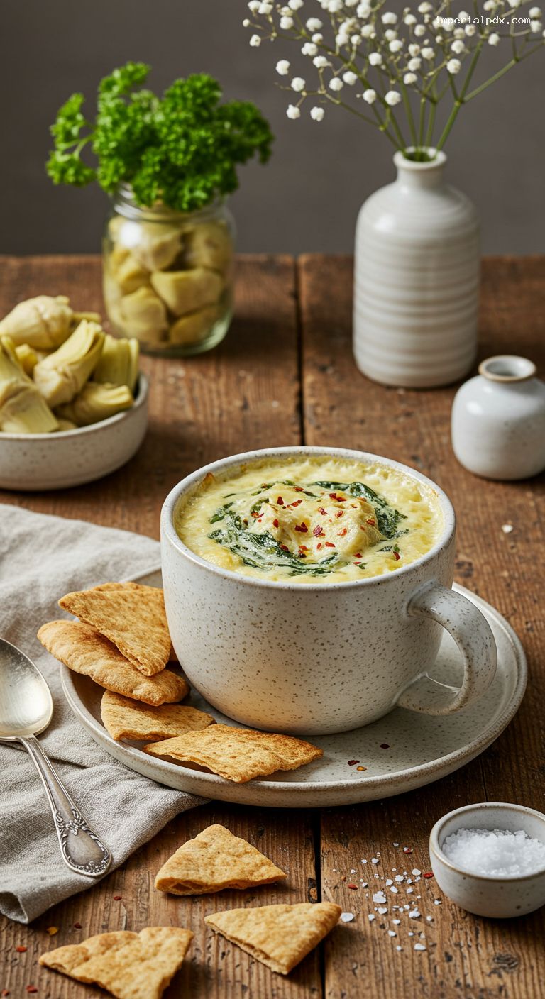- All the cozy, creamy spinach–artichoke dip flavor in a single mug—ready in minutes.
