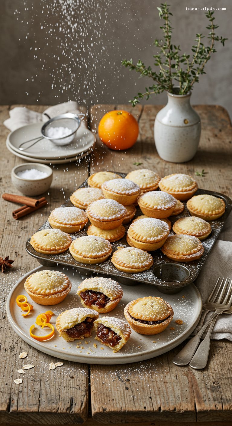 Mincemeat: Refrigerate in a sealed jar for up to 2 weeks or freeze for 3 months. Pastry: Wrap and chill up to 2 days or freeze for 1 month; thaw overnight in the fridge. Baked pies: Keep in an airtight tin at room temperature for up to 3 days or refrigerate for 5 days. Rewarm at 160°C/320°F for 8–10 minutes and dust with fresh powdered sugar. Unbaked pies: Freeze on a tray until solid, then bag; bake from frozen at 190°C/375°F for 20–22 minutes.