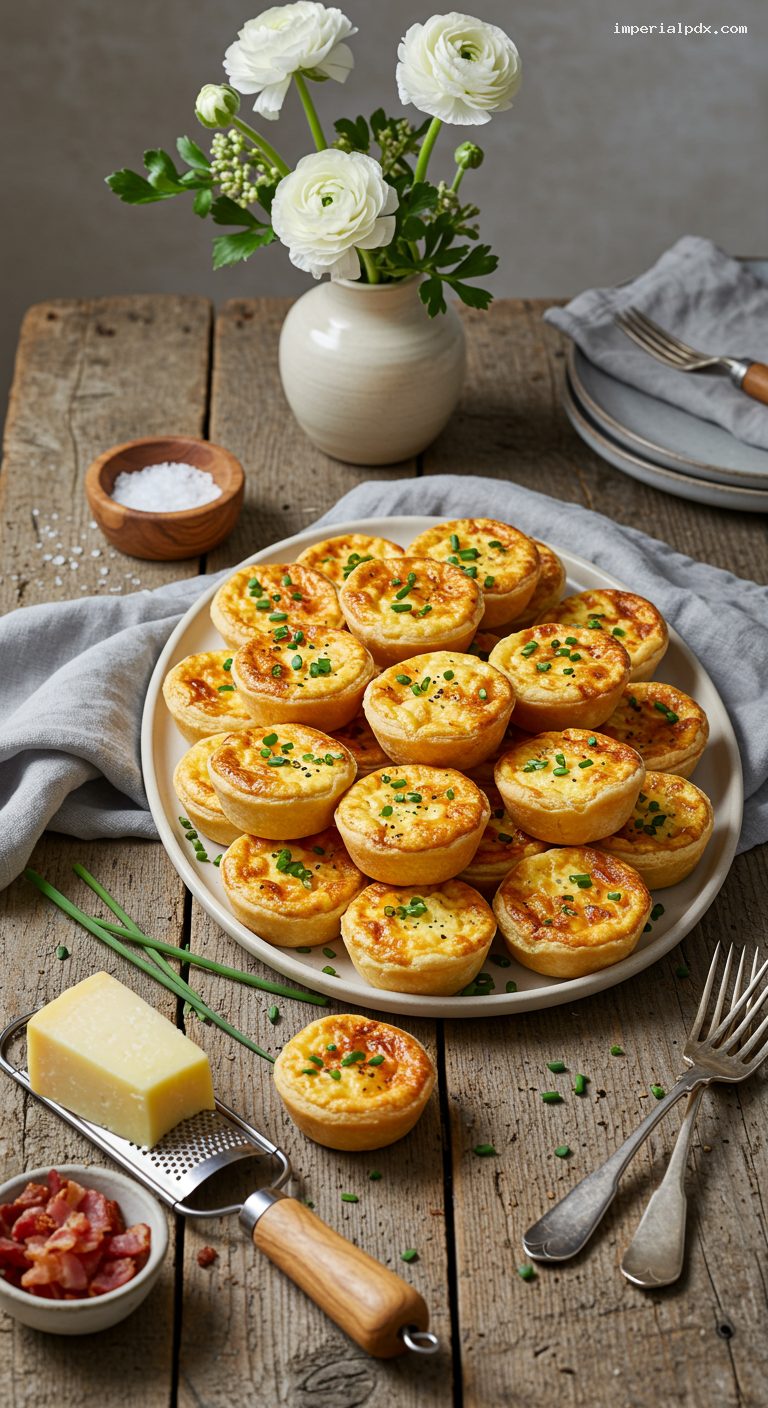 Refrigerate cooled quiche bites in an airtight container up to 3 days. Reheat on a baking sheet at 325°F (165°C) for 8–10 minutes. Freeze baked bites on a tray until solid, then store up to 2 months; reheat from frozen at 325°F (165°C) for 12–15 minutes. Make-ahead components: cut-and-fitted raw shells can be frozen in the tins up to 1 month; bake straight from frozen, adding 1–2 minutes to the par-bake time. The custard can be mixed and refrigerated up to 24 hours; re-whisk before using.