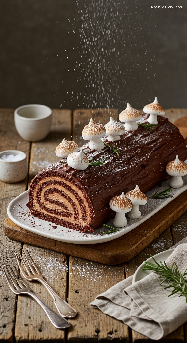 Set the log on a serving board. If using the branch piece, attach it to the side with a dab of ganache. Frost the log with ganache, leaving the ends exposed to show the spiral. Create bark texture by dragging a fork or small offset spatula along the length and swirling knots. Arrange meringue mushrooms on and around the log, securing with dots of ganache. Tuck in a few rosemary sprigs if using. Dust lightly with powdered sugar for “snow.” Chill 15 minutes to set, then serve at cool room temperature.