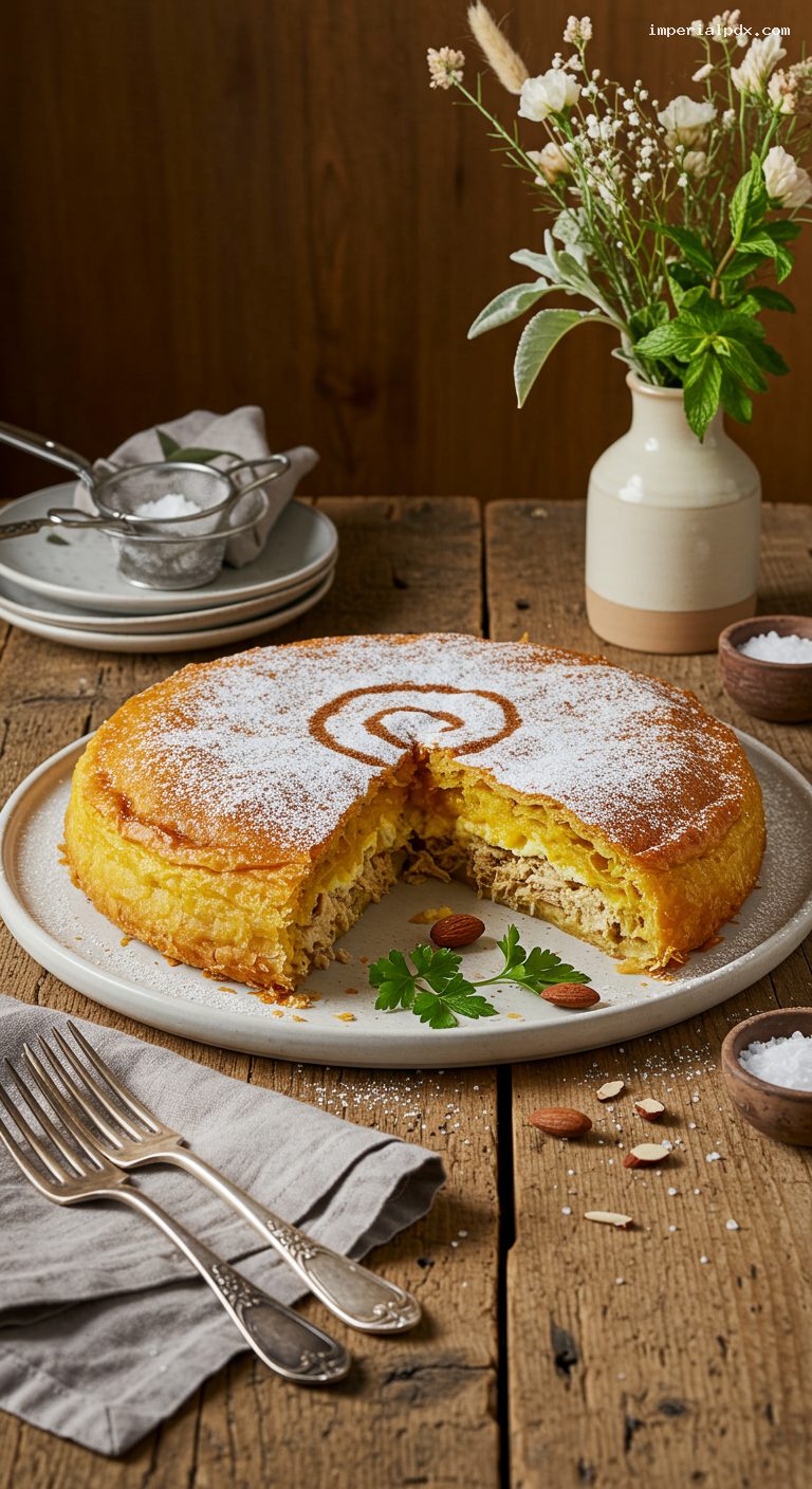 Set the pan on a preheated baking sheet (for extra bottom crisp) and bake on the center rack until the pastilla is deep golden and crisp, 30–35 minutes. If the top needs extra color, broil briefly (30–60 seconds), watching closely. Rest 10 minutes. Run a knife around the edge, invert the pastilla onto a rack, then invert again onto a serving platter so the smooth side is up.