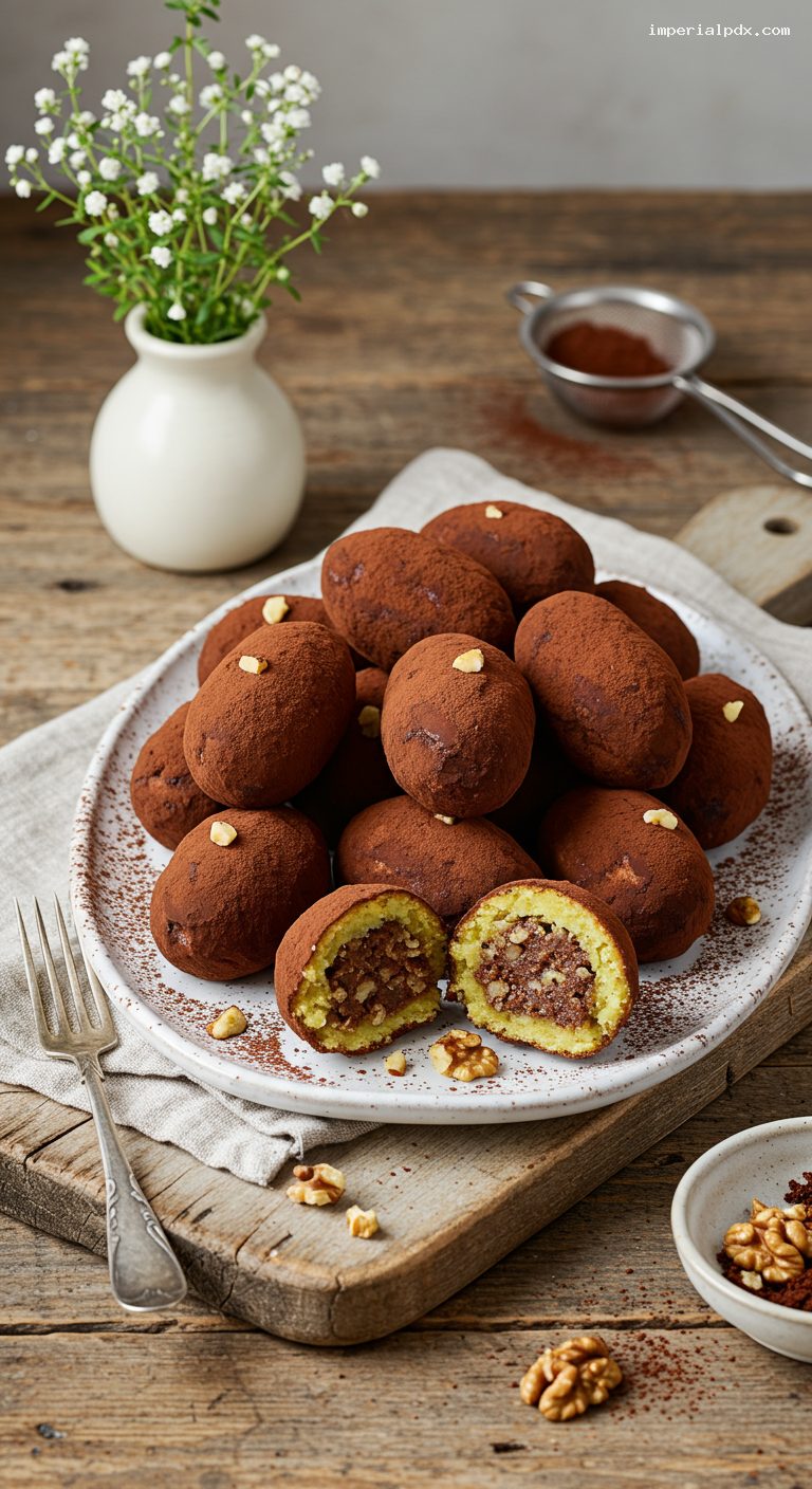 Pour the remaining 15 g (3 tbsp) cocoa into a shallow dish. Roll each oval to coat evenly, tapping off excess. For a dusty “fresh from the soil” look, sift a whisper of powdered sugar over parts of the surface after coating.