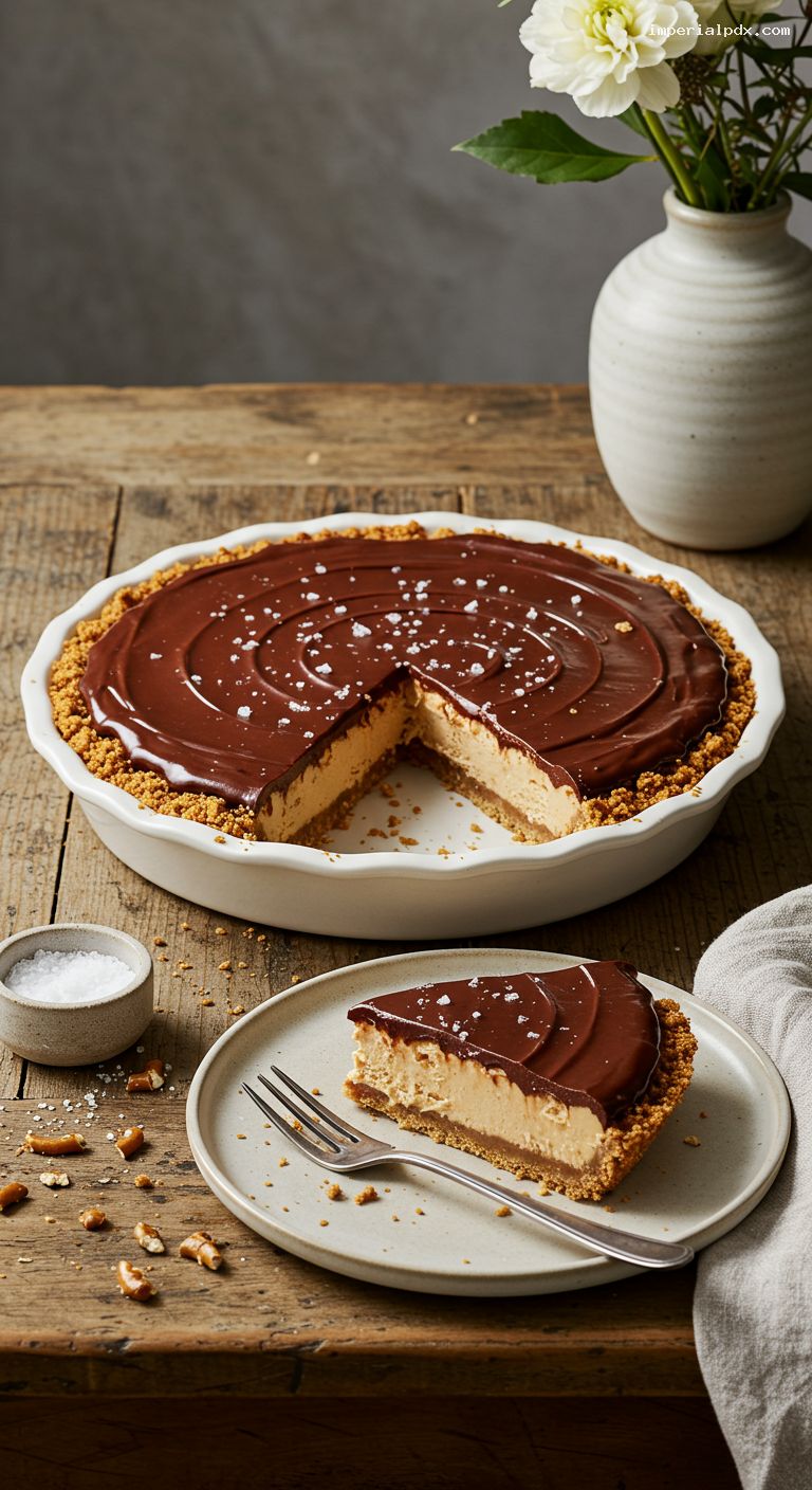 Pour ganache over the pie and tilt the plate to coax it to the edges in a thin, even layer. Tap gently to level. Sprinkle a pinch of flaky sea salt over the glossy surface. Refrigerate 2–3 hours (up to 24 hours) until fully set. For clean slices, warm a sharp knife under hot water, wipe dry between cuts, and sprinkle a final pinch of flaky salt just before serving. Let the pie stand at room temperature for 10 minutes for the creamiest texture.
