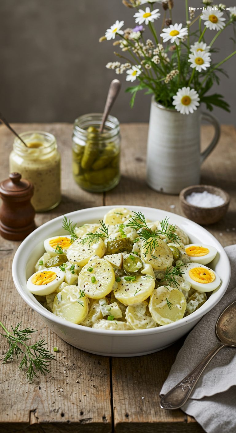 Cover and chill for at least 30 minutes (up to 24 hours) to let the flavors meld. Before serving, let the salad sit at room temperature for 10–15 minutes for the best texture. Garnish with extra dill and snipped chives. Serve slightly cool alongside schnitzel, grilled sausages, or smoked fish.