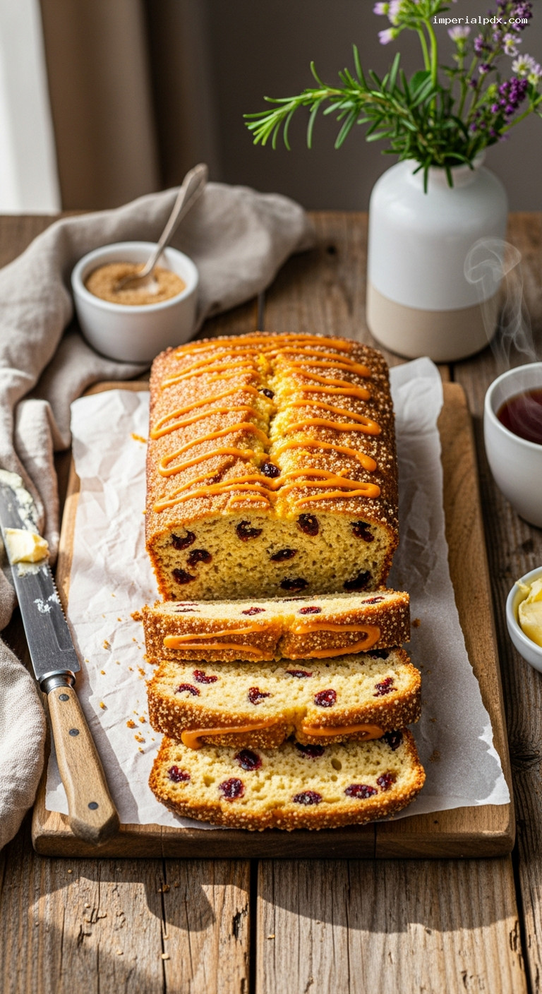 Cool the loaf in the pan for 15 minutes, then lift it out to a wire rack. For the optional orange drizzle, whisk confectioners’ sugar with 1–2 tablespoons orange juice and a pinch of salt until thick but pourable. Drizzle over the warm loaf and let set. Cool completely before slicing with a serrated knife. Serve plain or with a pat of butter.