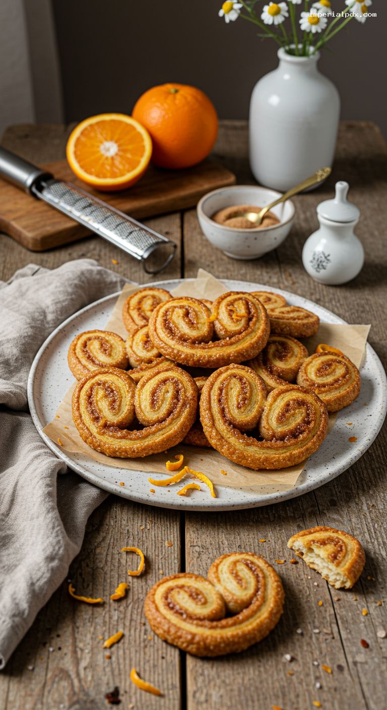 Store fully cooled palmiers in an airtight container at room temperature for up to 3 days. To re-crisp, warm on a parchment-lined pan at 350°F (175°C) for 4–5 minutes. For make-ahead, freeze the shaped, sliced cookies in a single layer until solid, then store in a freezer bag for up to 2 months. Bake from frozen at 400°F (200°C), adding 1–2 minutes to the bake time.