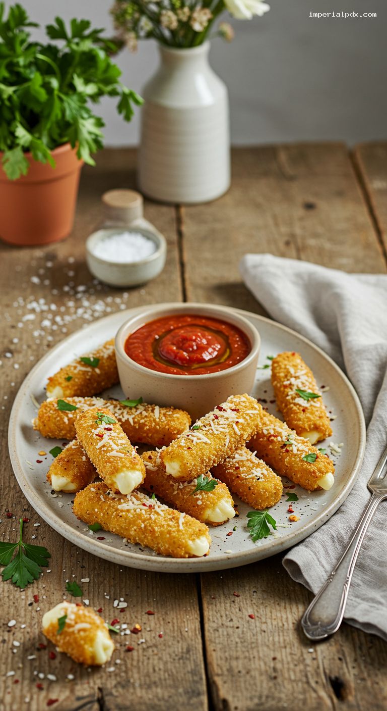 Ladle the warm marinara into small ramekins or cups—one per person if serving individually. Arrange the mozzarella sticks around the cups on a platter. Garnish with extra Parmesan and a little parsley. Serve immediately while everything is hot and crisp.