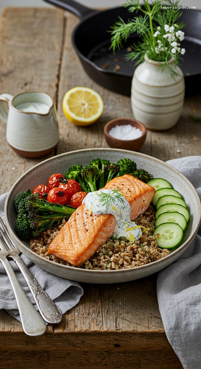 - 6. Assemble bowls: farro, roasted veg, fresh cucumber, salmon. Drizzle lemon–dill yogurt; garnish with extra dill and lemon wedges.