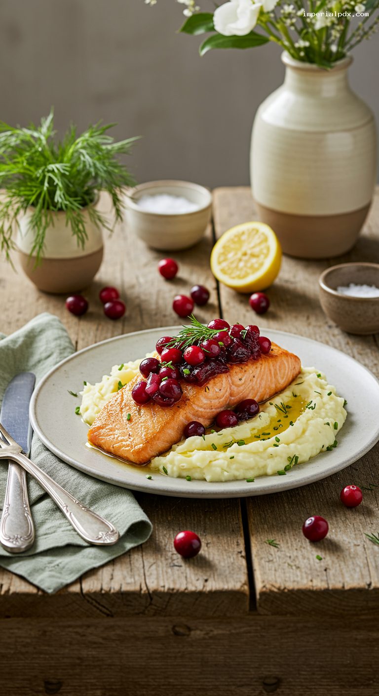 The cranberry-dill relish can be made up to 3 days ahead; refrigerate in a covered container and fold in fresh dill just before serving for brightest flavor. The lemon-garlic butter can be made up to 2 days ahead; rewarm gently over low heat. Mashed potatoes are best fresh but can be held warm up to 1 hour over very low heat, covered, with a splash of warm milk stirred in before serving. Cooked salmon is best the day it’s made; leftovers keep 2 days refrigerated. Reheat gently at 275°F for 10–12 minutes or in a covered skillet over low heat until just warmed.