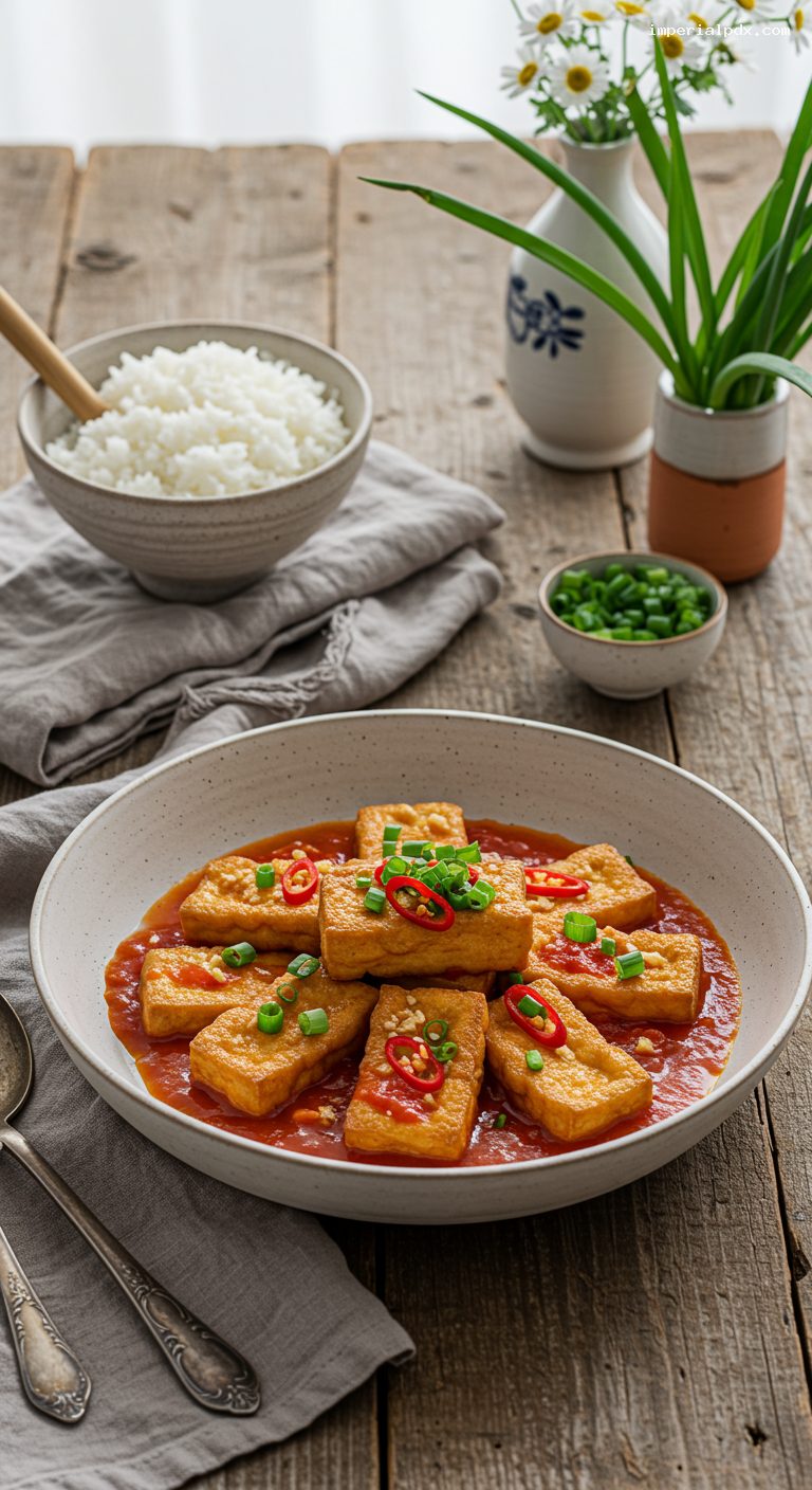 - 6) Nestle tofu into sauce; simmer 3–4 minutes. Finish with scallion greens and vinegar/lime. Adjust salt, pepper, and heat.