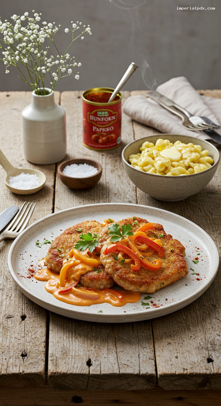 - Silky paprika cream sauce with tender, golden-seared pork cutlets.
