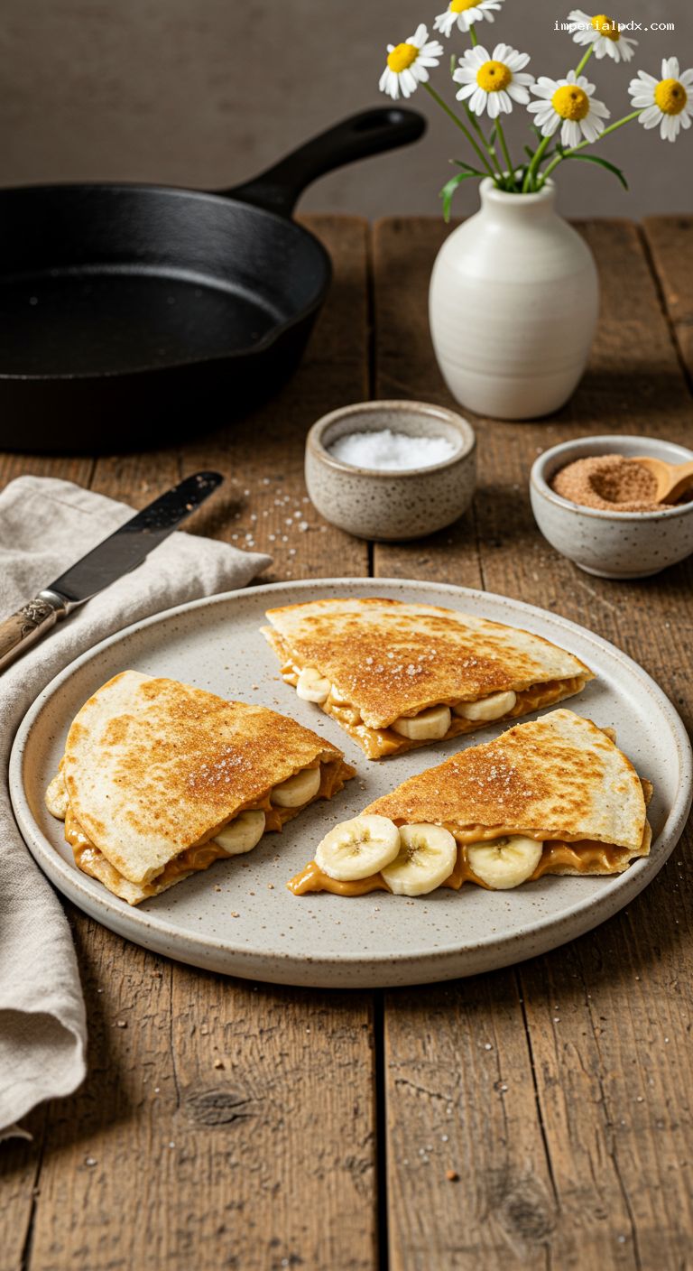Best enjoyed fresh while the tortilla is crisp and the peanut butter is gooey. If you have leftovers, cool completely, then refrigerate in an airtight container for up to 1 day. Reheat in a skillet over medium heat 1–2 minutes per side or in a toaster oven at 350°F for 6–8 minutes until warmed through and re-crisped. Avoid the microwave (it softens the tortilla). Mix the cinnamon-sugar up to a week ahead and store sealed. Slice bananas right before cooking; if pre-slicing is necessary, toss very lightly with a few drops of lemon juice and pat dry (flavor will be slightly tangier).
