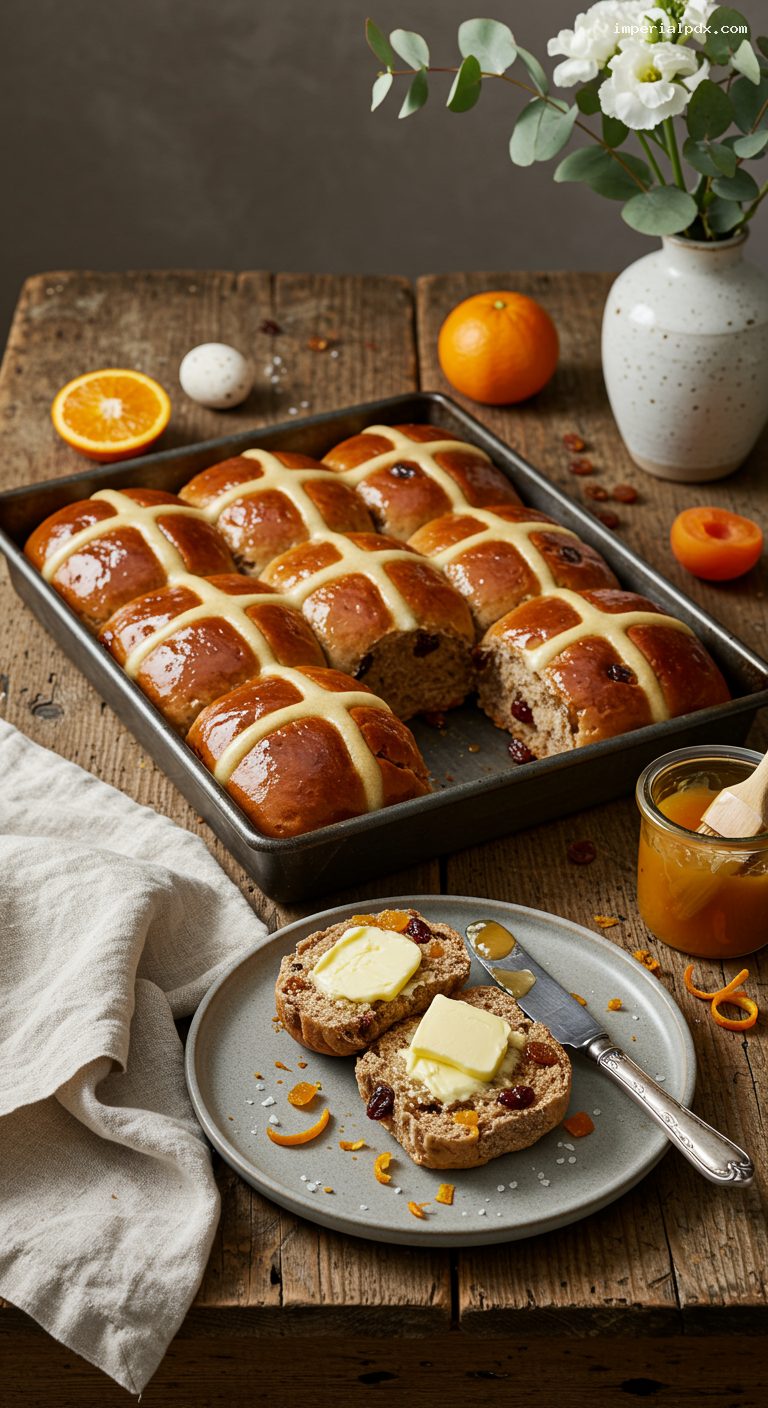 - 6. Pipe flour paste crosses; bake 20–22 minutes until deep golden (93°C/200°F internal). Brush with warm apricot glaze; cool 15 minutes.