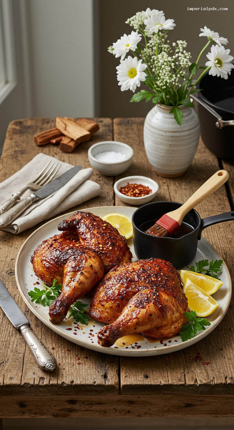 - Pantry: 2 whole chickens; kosher salt; coarse black pepper; sweet paprika; garlic powder; cayenne (optional); apple cider vinegar; brown sugar; crushed red pepper flakes; Worcestershire; neutral oil; charcoal; hardwood chunks (hickory, oak, or pecan)
