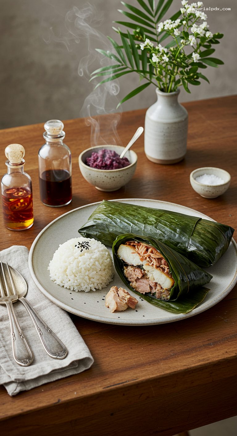 - 7) Rest 10 minutes; unwrap ti leaves; serve the tender luʻau-wrapped pork and fish with rice, poi, and a dab of chili water.