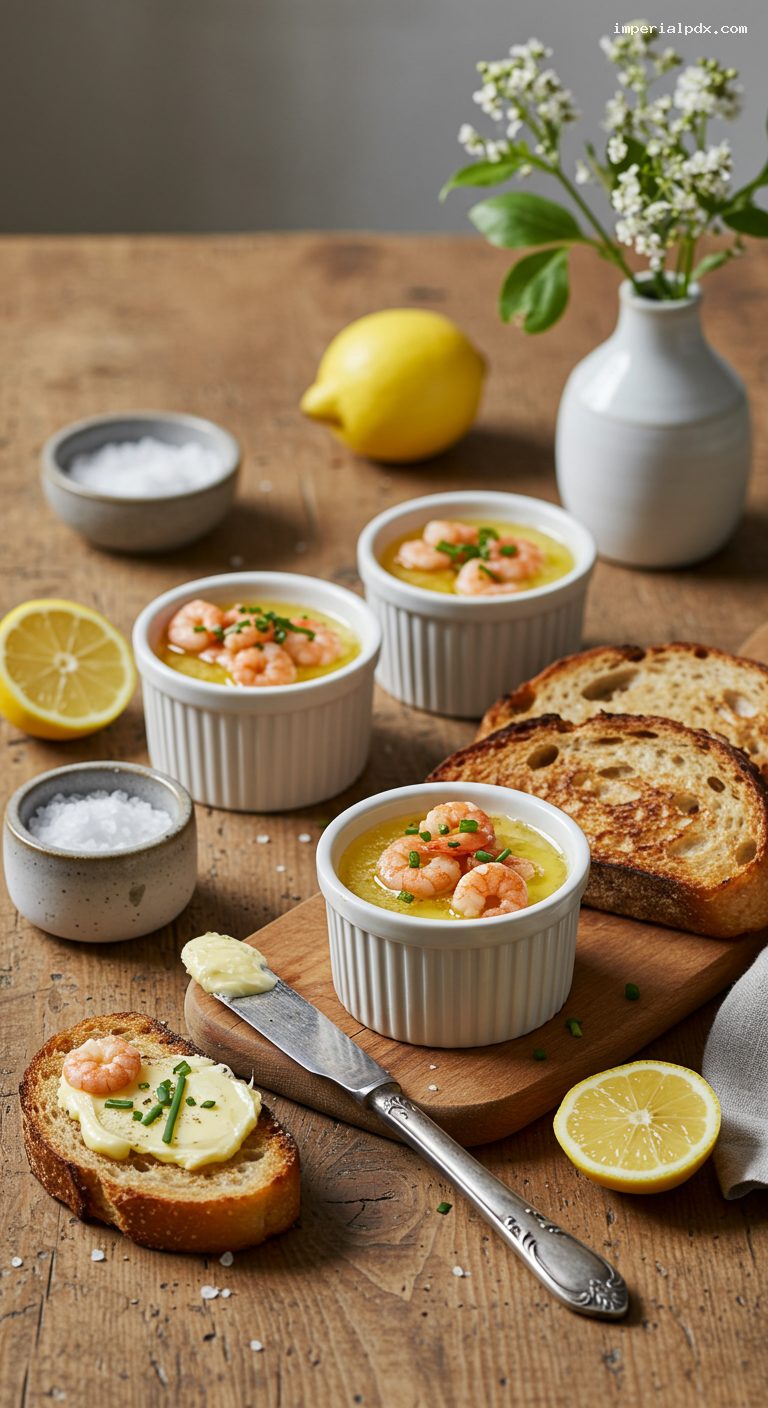 Remove the ramekins from the fridge 10–15 minutes before serving so the butter softens slightly for easy spreading. Toast the bread at 200°C/400°F for 6–8 minutes (or use a toaster) until crisp and golden. Serve the potted shrimp with hot toast and lemon wedges. Spread generously and finish with a pinch of flaky sea salt if you like.
