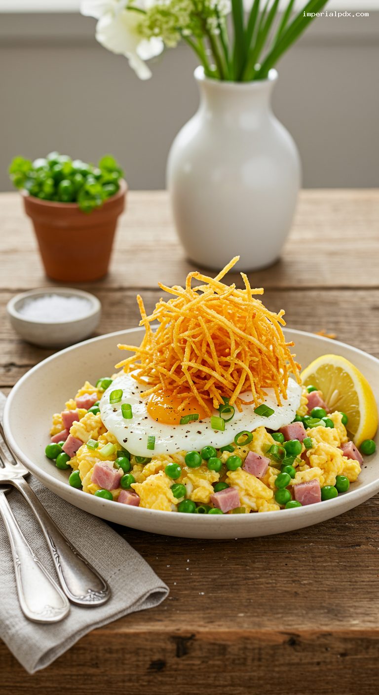 - Balanced flavors: salty ham, sweet peas, bright scallions, and a lemony finish.