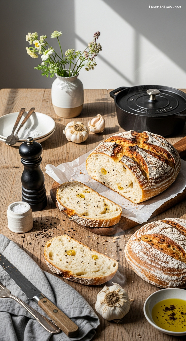 Transfer the loaf to a wire rack and cool for at least 1 hour before slicing. This sets the crumb and keeps the interior moist, showcasing the flecks of roasted garlic and cracked pepper in every slice.