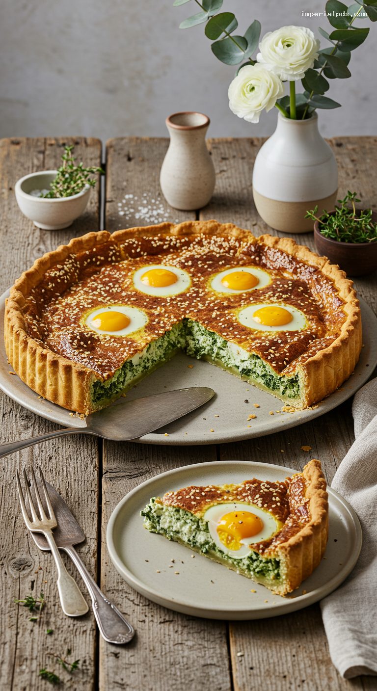 - Classic tarta pascualina flavors: silky spinach and ricotta perfumed with nutmeg, with sunny whole eggs inside.