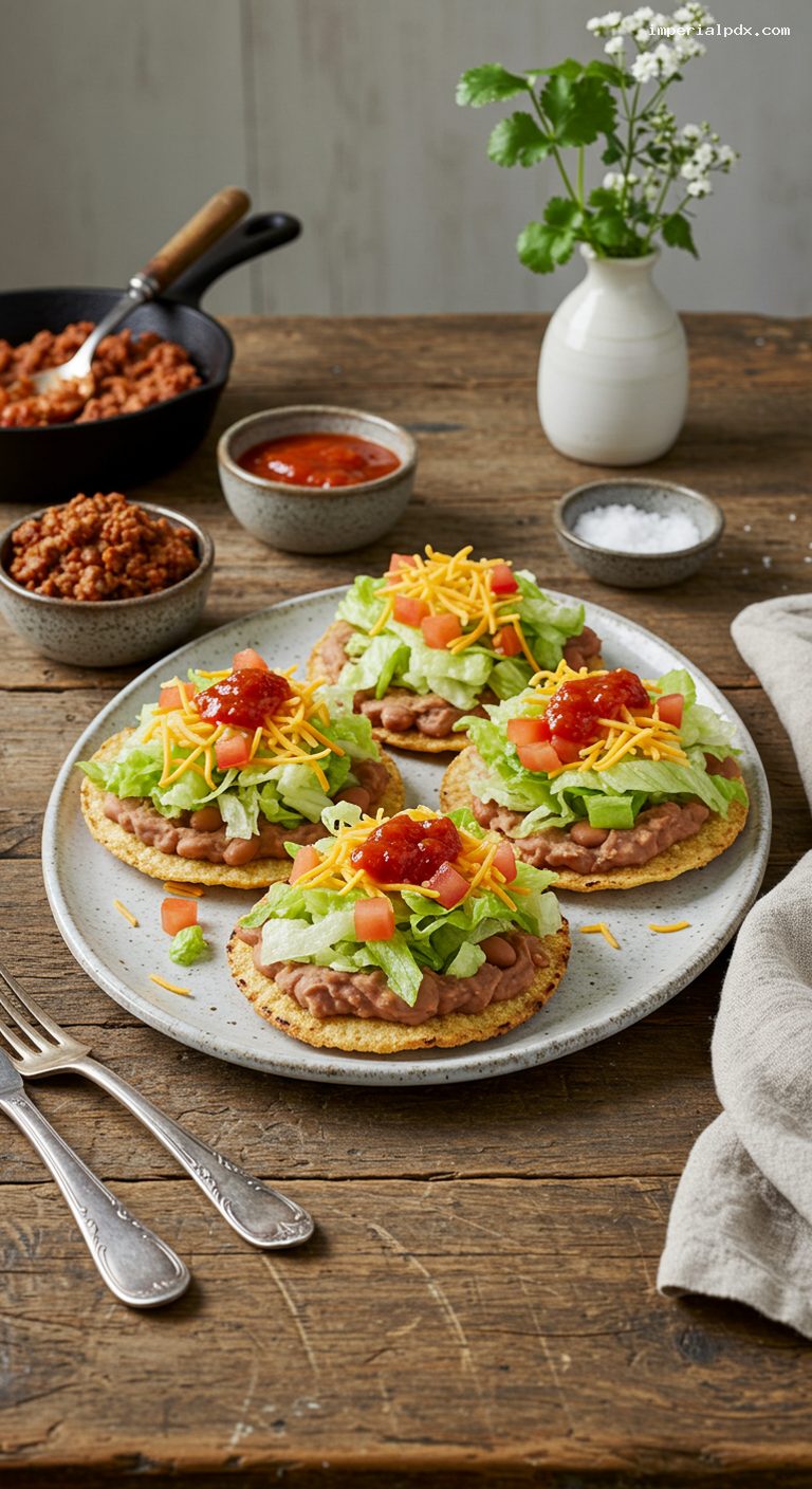 If using, spoon 1–2 tablespoons picadillo over the beans. Top each chalupa with a small handful of shredded lettuce, a spoonful of diced tomatoes, and about 1 ounce grated cheddar (roughly 1/4 cup). Avoid piling too high so the tortilla stays crisp.