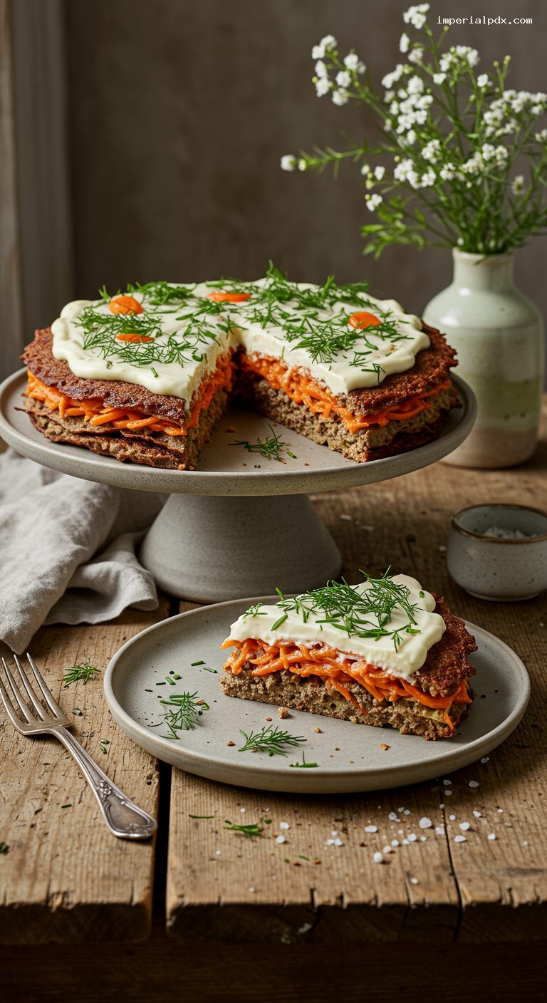 Place the first pancake on a flat plate or cake stand. Spread a thin swipe (about 1 tbsp) of garlicky mayo to the edges, then a very thin layer (2–3 tbsp) of the cooled carrot–onion mixture. Top with another pancake and repeat, keeping layers even and modest so the cake is stable and slices cleanly. Finish with a pancake topped with just mayo. You should have 9–10 filled layers plus the top.