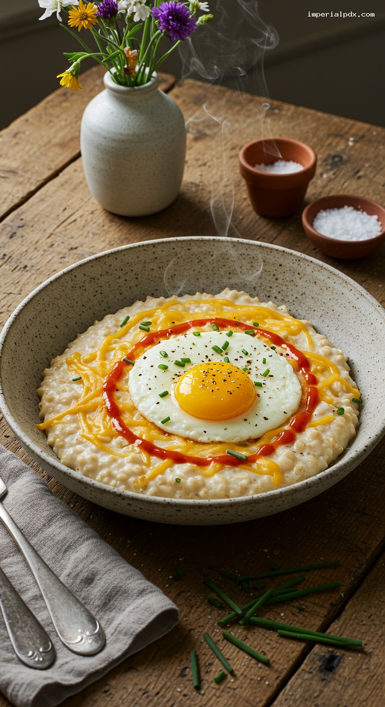 Divide the cheesy oats between two warm bowls. Top each with a soft egg. Finish with extra black pepper, another drizzle of hot sauce, and optional chives or scallions. Serve immediately while everything is hot and velvety.