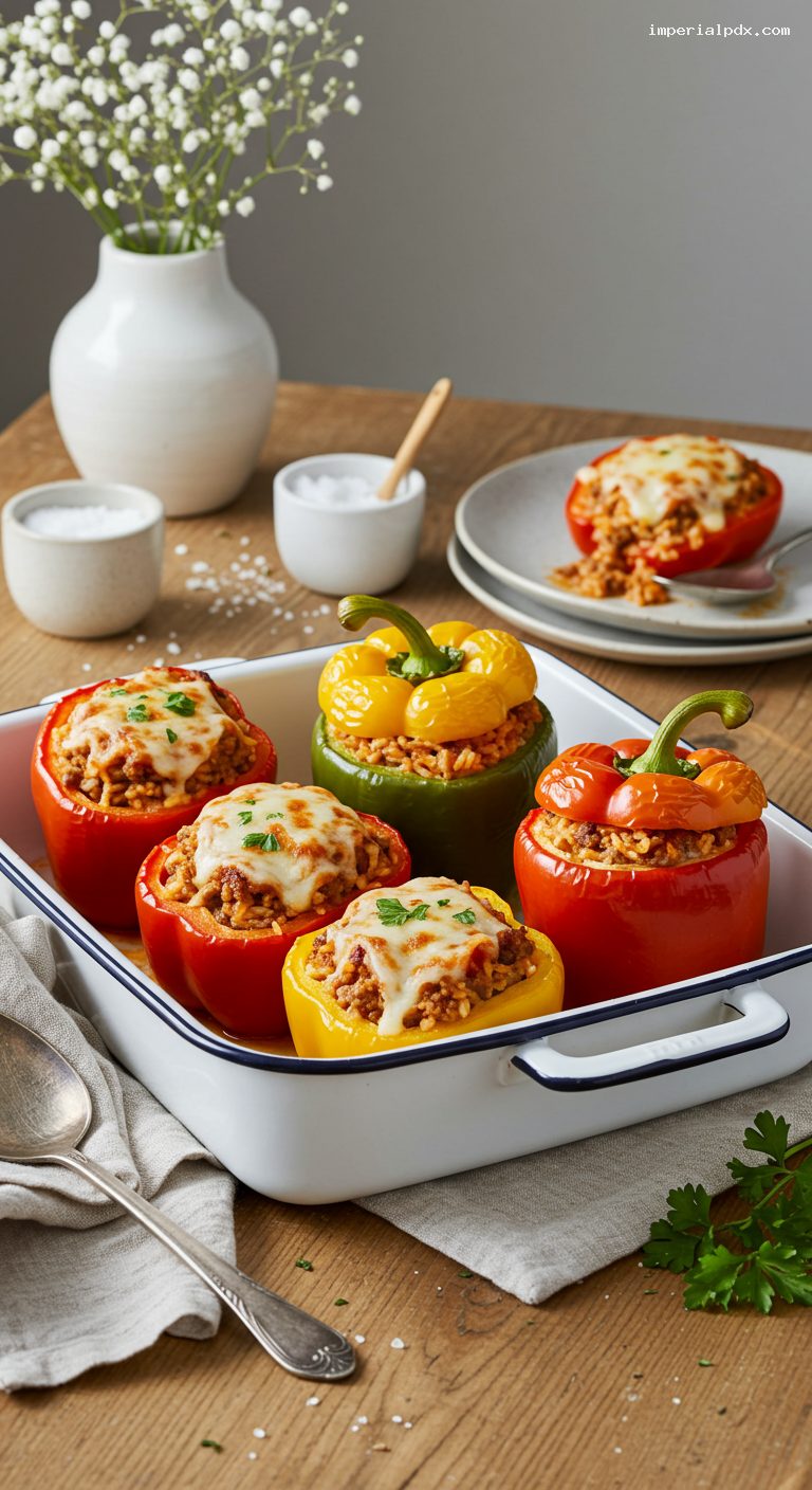Refrigerate cooled stuffed peppers in an airtight container for up to 4 days. Reheat covered at 350°F (177°C) for 20–25 minutes, or microwave in 60–90 second bursts until hot. Freeze individually wrapped peppers (without the final cheese topping for best texture) for up to 2 months; thaw overnight and reheat covered at 350°F for 25–30 minutes, then add cheese and bake 5–8 minutes to melt. For make-ahead, prepare the filling up to 2 days in advance and stuff/bake when ready.