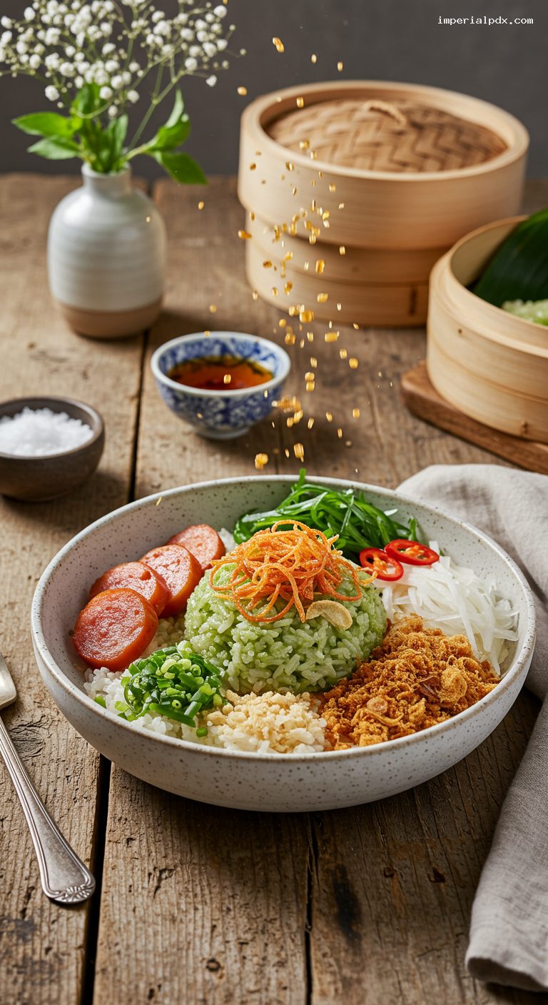 - 6. Steam drained rice in a cloth-lined steamer over boiling water 25–30 min, fluffing once and sprinkling 2 tbsp hot water mid-steam. Bowl up with toppings, scallion oil, pickles, and crispy shallots.