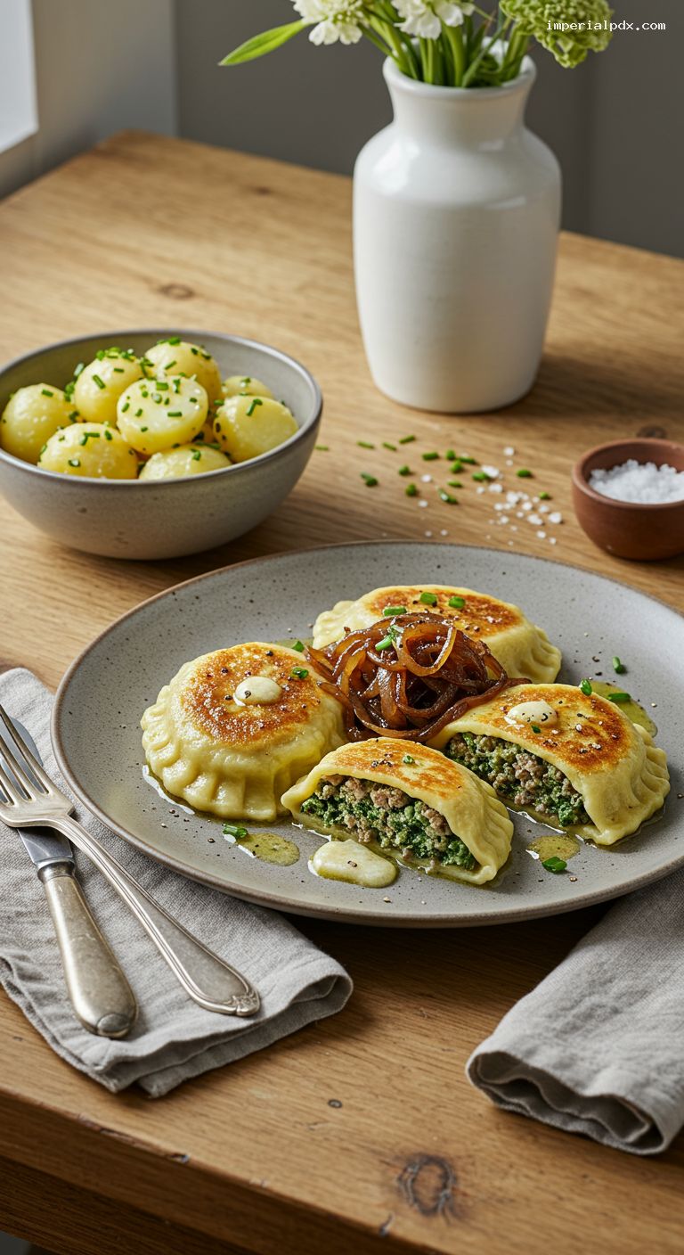- 7. Slice warm potatoes; whisk vinegar, Dijon, hot broth; toss, then fold in oil and chives. Pan-fry Maultaschen in brown butter, top with onions, serve with potato salad.