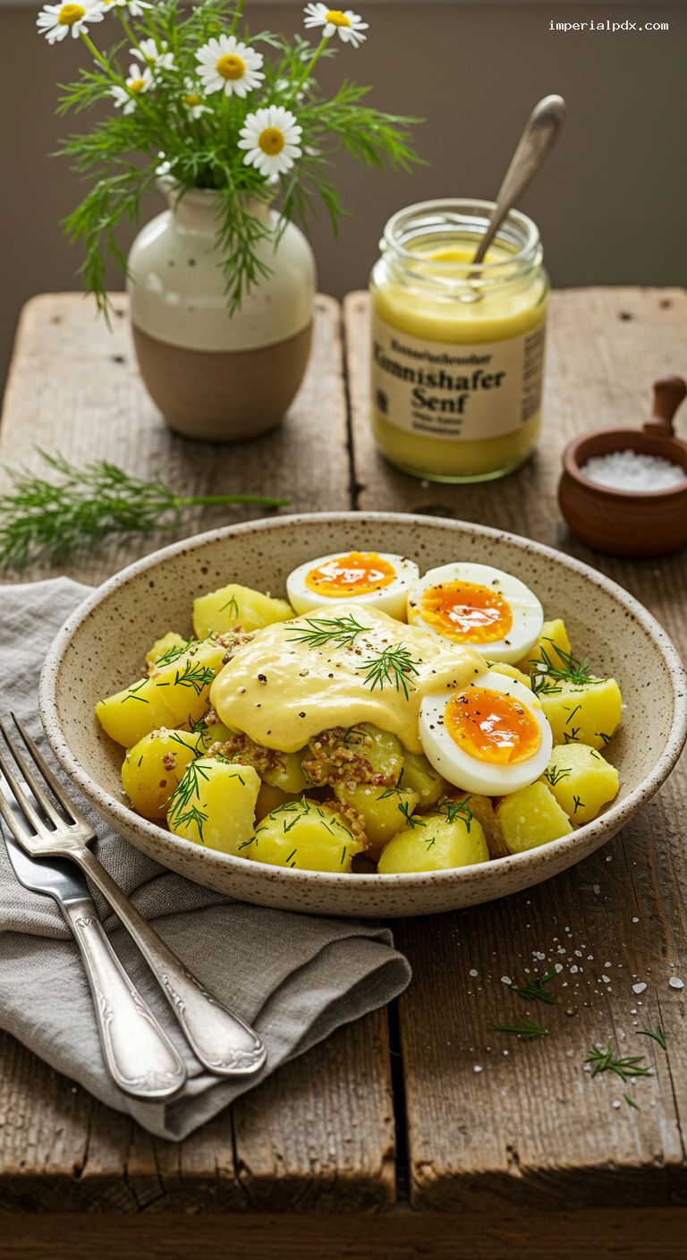 - 6. Peel eggs, halve. Plate potatoes, nestle eggs, spoon on mustard sauce, garnish with dill; serve immediately.