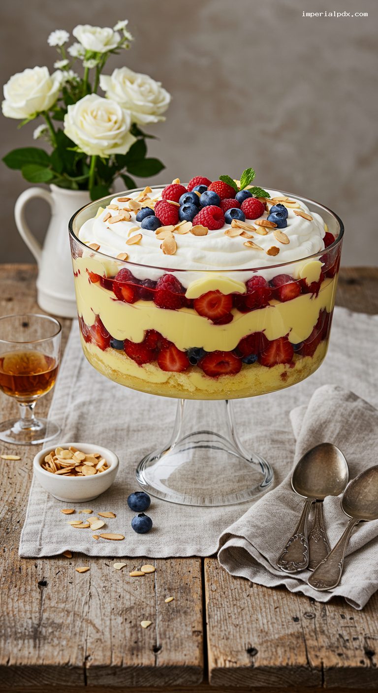 - Balanced textures: tender sherry-kissed sponge, silky custard, juicy berries, and crunchy toasted almonds.