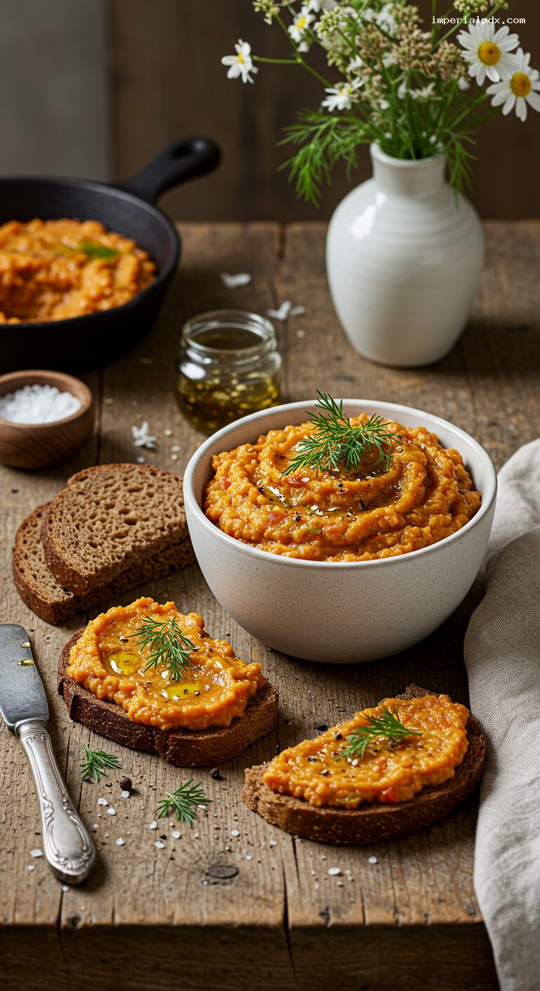 Toast rye bread to crisp edges. Pile on 2–3 tablespoons of the warm or chilled spread, swirl the top with the back of a spoon, and shower with chopped dill and parsley. Finish with a few grinds of black pepper and, if you like, a tiny drizzle of sunflower oil. Serve immediately.