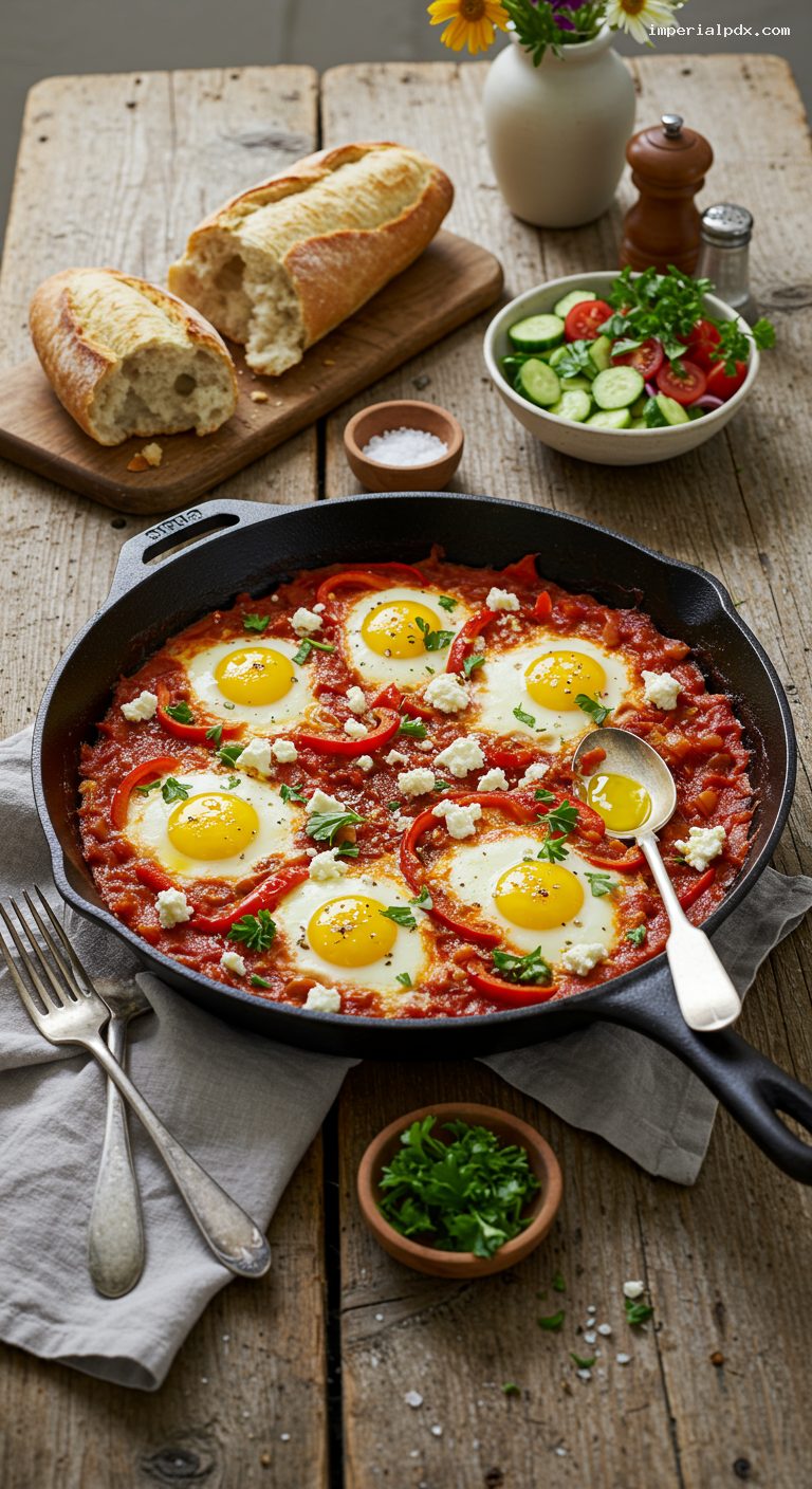 Drizzle 1 tablespoon olive oil over the skillet, then scatter the crumbled feta and chopped parsley. Let it stand 1 minute off heat (the eggs will gently finish cooking). Serve the skillet straight to the table on a trivet with the warm crusty bread for scooping and the bright chopped salad on the side.