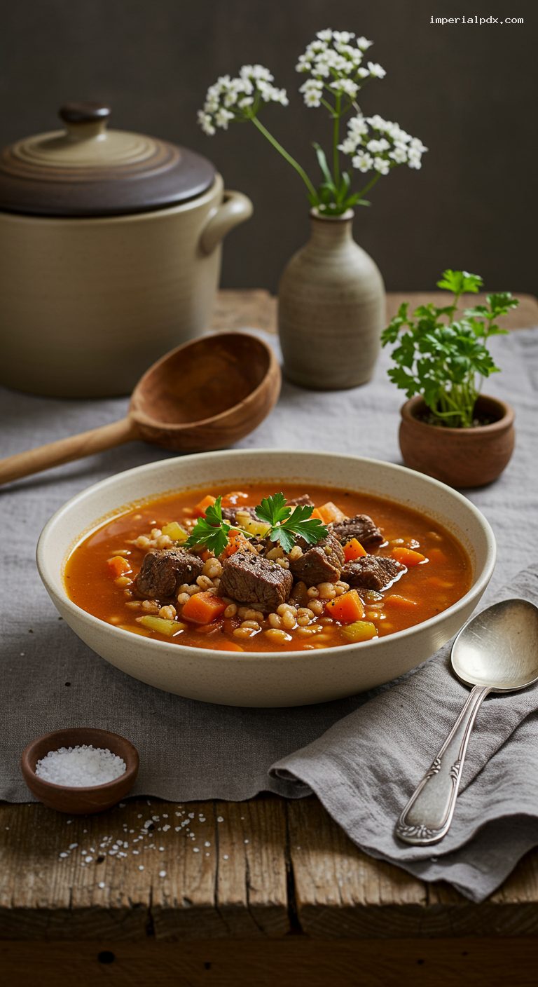 - Balanced and hearty: tender beef, plump pearl barley, and vegetables in a rich, tomato-kissed beef broth.
