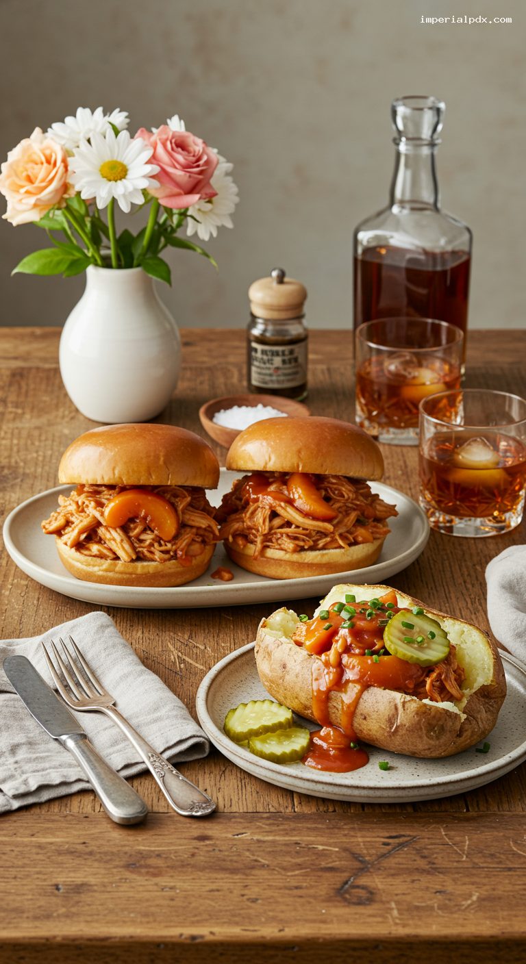 For sandwiches, toast buns and pile on the sticky bourbon-peach chicken. Add pickles and slaw. For loaded potatoes, split baked russets, fluff with a fork, and top generously with the chicken, chives, and optional sour cream. Serve hot.