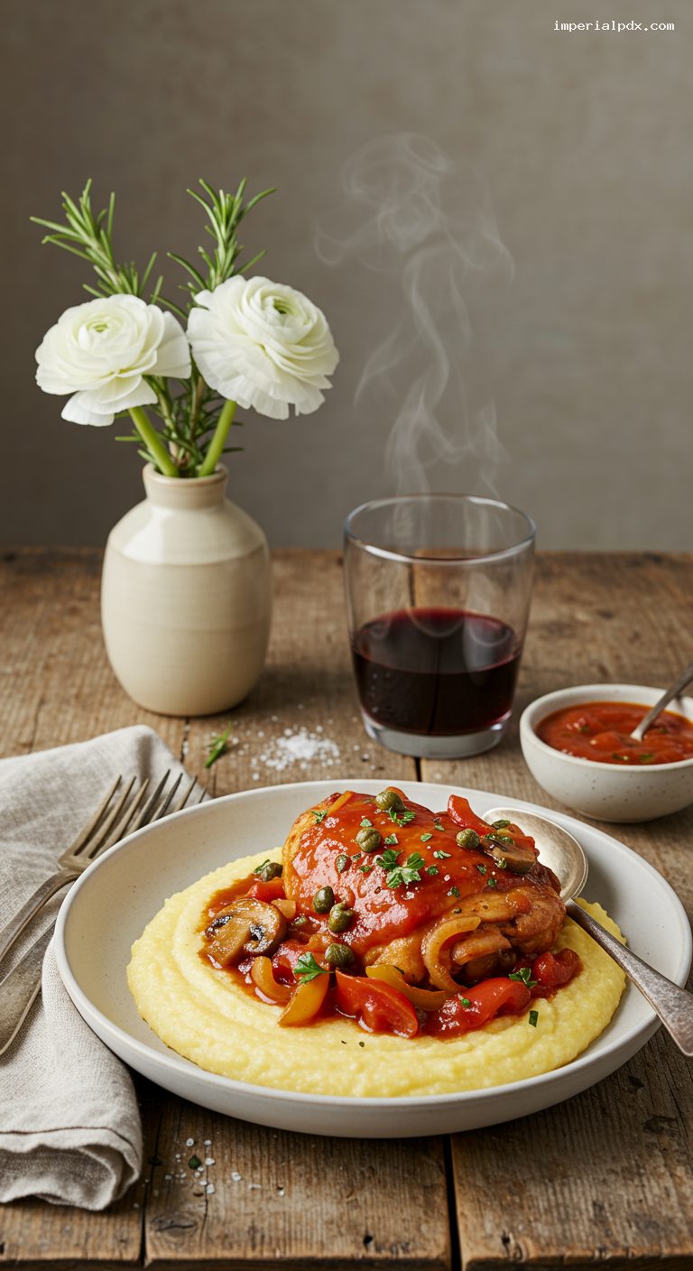 - Pantry: Bone-in chicken thighs, olive oil, crushed tomatoes (28 oz), dry red wine, capers, kosher salt, black pepper, red pepper flakes (optional), polenta or wide egg noodles