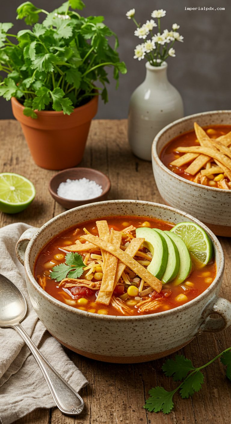 Refrigerate soup (without tortilla strips) in airtight containers for up to 4 days. Freeze up to 3 months; thaw overnight in the fridge. Reheat gently on the stovetop or in the microwave until steaming hot (165°F). Store tortilla strips at room temperature in an airtight container for up to 3 days and add at serving so they stay crisp. If making ahead for a crowd, cook and shred the chicken a day early; reheat the soup in the slow cooker on LOW for 1–2 hours, then finish with lime and cilantro just before serving.
