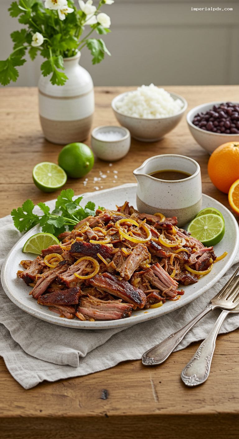 Cover and cook on LOW for 8 to 10 hours (or on HIGH for 4 to 5 hours), until the pork is very tender and shreds easily with two forks. The internal temperature should register 195 to 205°F in the thickest part. Transfer the pork to a rimmed sheet pan. Strain the cooking liquid into a saucepan, skim excess fat, and reduce over medium-high heat to about 1 cup. Meanwhile, bring the reserved 1/4 cup marinade to a full boil for 1 minute to make a safe finishing mojo. Preheat the oven broiler to High and position a rack about 6 inches from the heating element.
