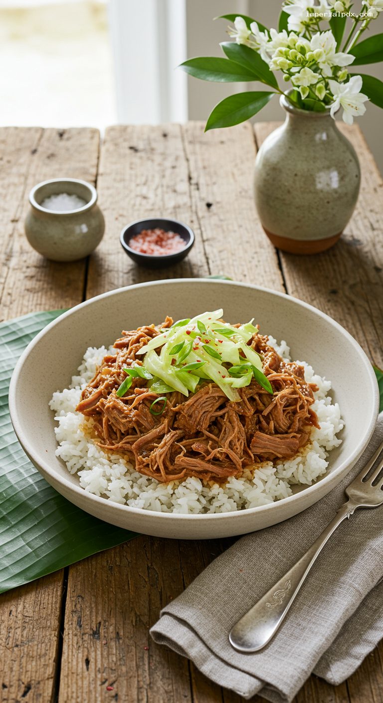 Spoon the smoky Kalua pork and wilted cabbage over hot cooked white rice. Garnish with sliced scallions and a tiny finishing pinch of alaea sea salt for color and crunch. Serve immediately.