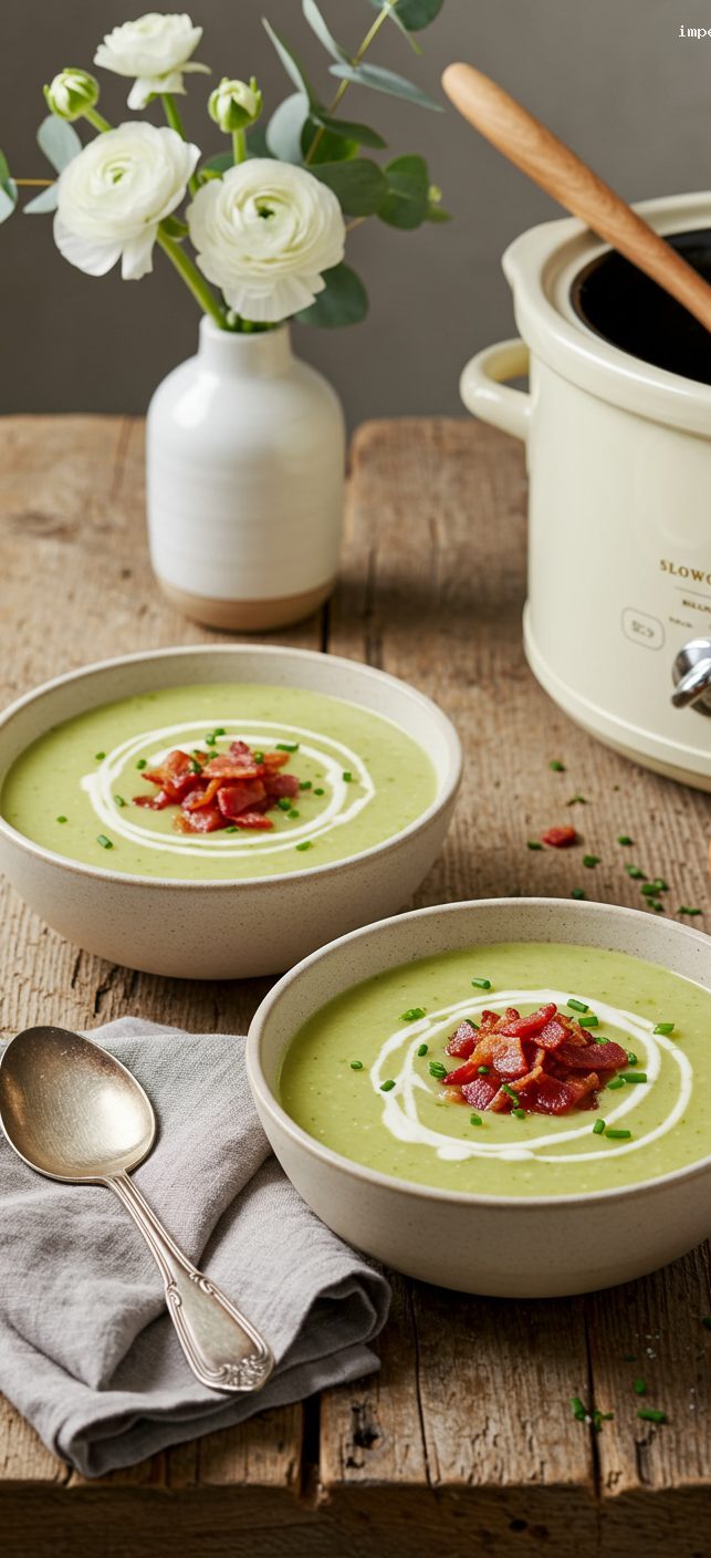 Cover and cook on LOW for 6 hours or on HIGH for 3 hours, until the potatoes are very tender and can be easily mashed with a spoon. While the soup cooks, crisp the bacon in a skillet over medium heat (8–10 minutes) or in a 400°F oven on a rack-lined sheet pan (12–18 minutes). Drain and crumble.