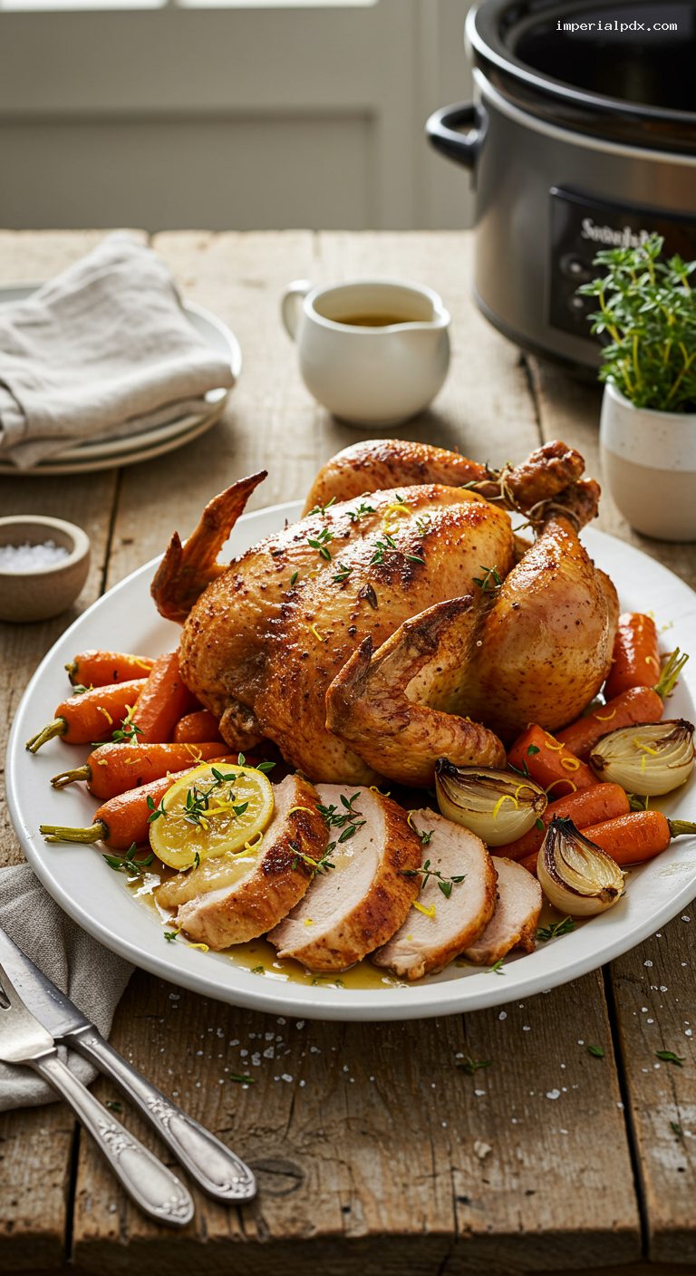- 5) Cook on High 4.5–5 hours or Low 7–8 hours until breast is 160–165°F and thigh is 175°F.