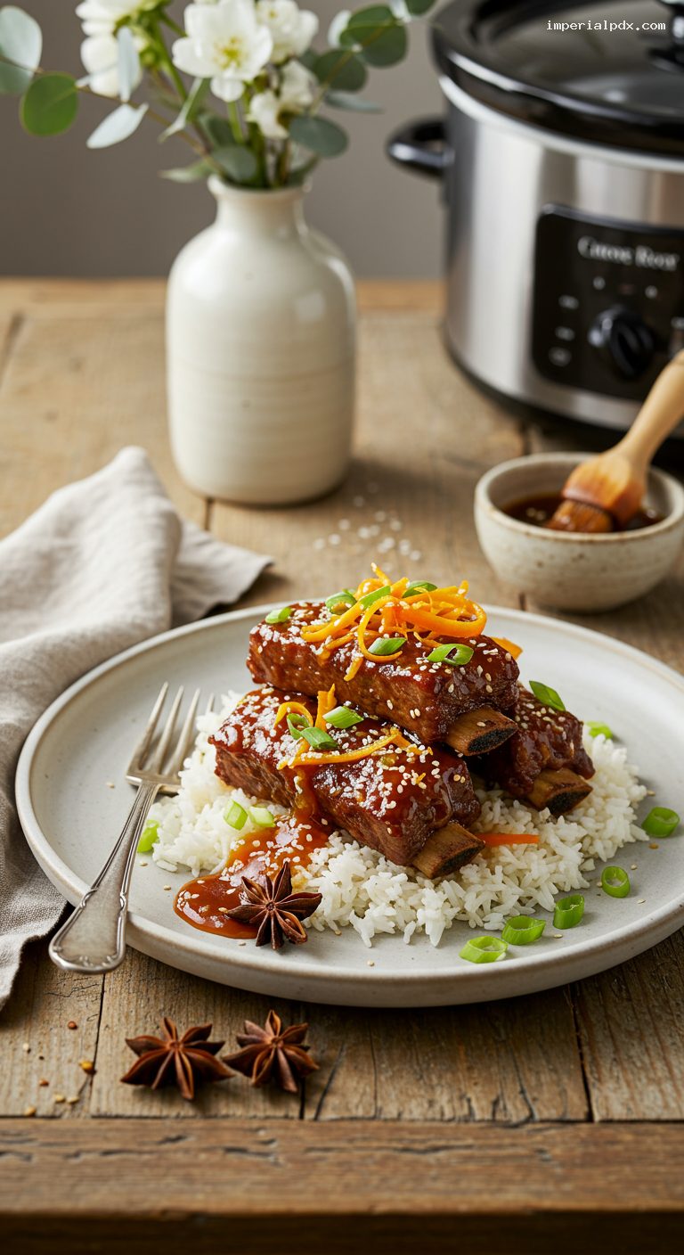 Spoon jasmine rice or mashed potatoes into warm bowls or plates. Nestle the lacquered short ribs on top and spoon over extra sauce. Garnish with sliced scallions, a sprinkle of sesame seeds, and a whisper of orange zest. Serve immediately.