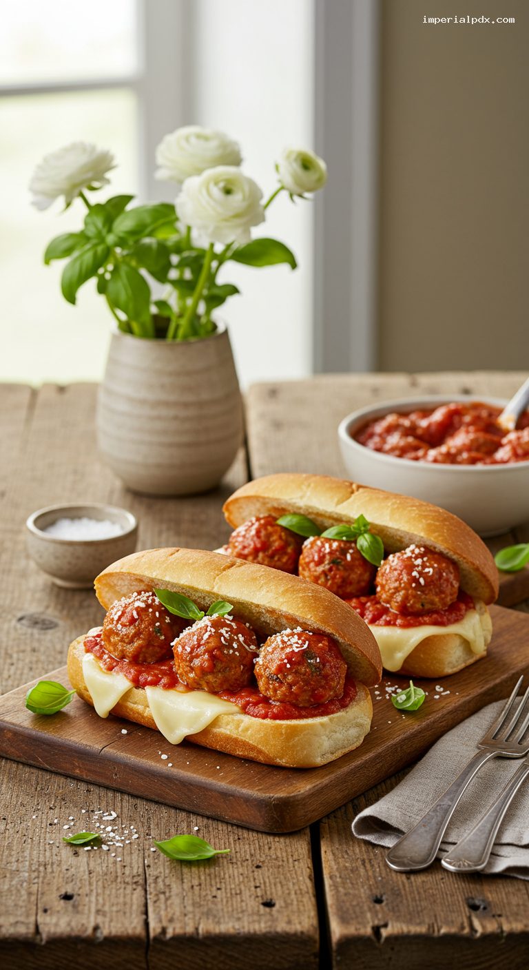 Split the hoagie rolls. For extra flavor, brush the cut sides with softened butter or a thin film of olive oil. Broil on a sheet pan, cut side up, until golden at the edges, 1–2 minutes. Add 1–2 slices of provolone to each roll and broil 30–60 seconds more until melty. Fill each roll with 3–4 meatballs, spoon on plenty of sauce, and finish with a shower of Parmesan and a few basil ribbons. Serve hot.