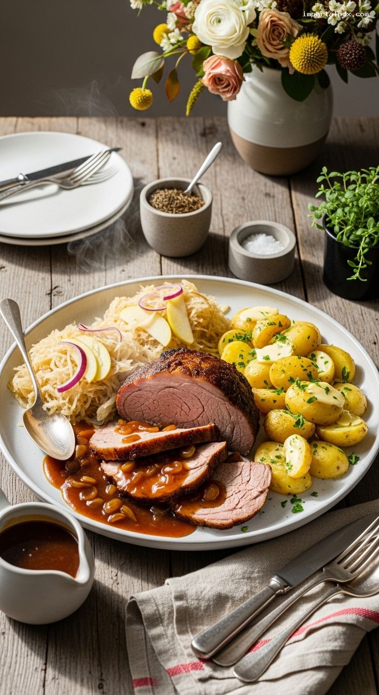 - Complete comfort plate: warm sauerkraut and parsley buttered potatoes, all ready while the roast rests.