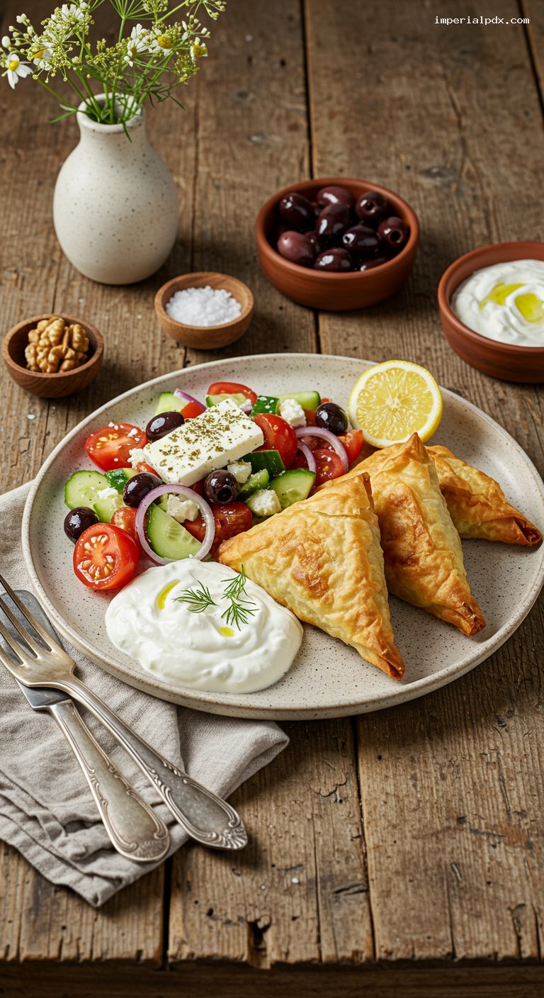 - 7. Plate 3 triangles with salad, a dollop of tzatziki, extra olives, and lemon wedges.