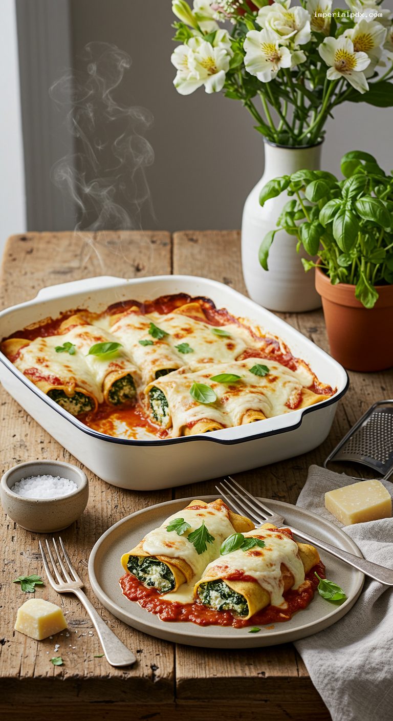 - A bright tomato sugo and silky white sauce balance the rich ricotta–greens filling.