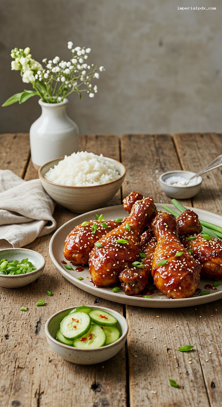 When the drumsticks are cooked, switch the oven to broil. Brush each drumstick generously with the hot glaze and broil 2–3 minutes, watching closely, until the edges are lightly charred and the sauce looks lacquered. Rest 5 minutes. Toss or brush with a little extra glaze, then scatter with sliced scallions and toasted sesame seeds. Serve hot with the quick pickled cucumbers and rice.