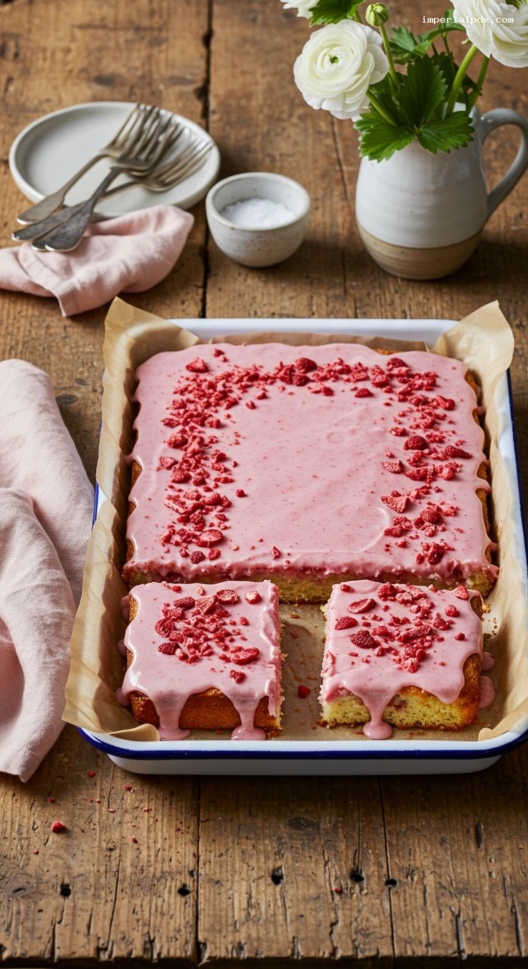 Pour glaze over the cooled cake and nudge to the edges with an offset spatula for a smooth, glossy finish. Immediately sprinkle with crushed freeze-dried strawberries. Let set 20–30 minutes, then lift out (using parchment), slice into 12 squares, and serve.