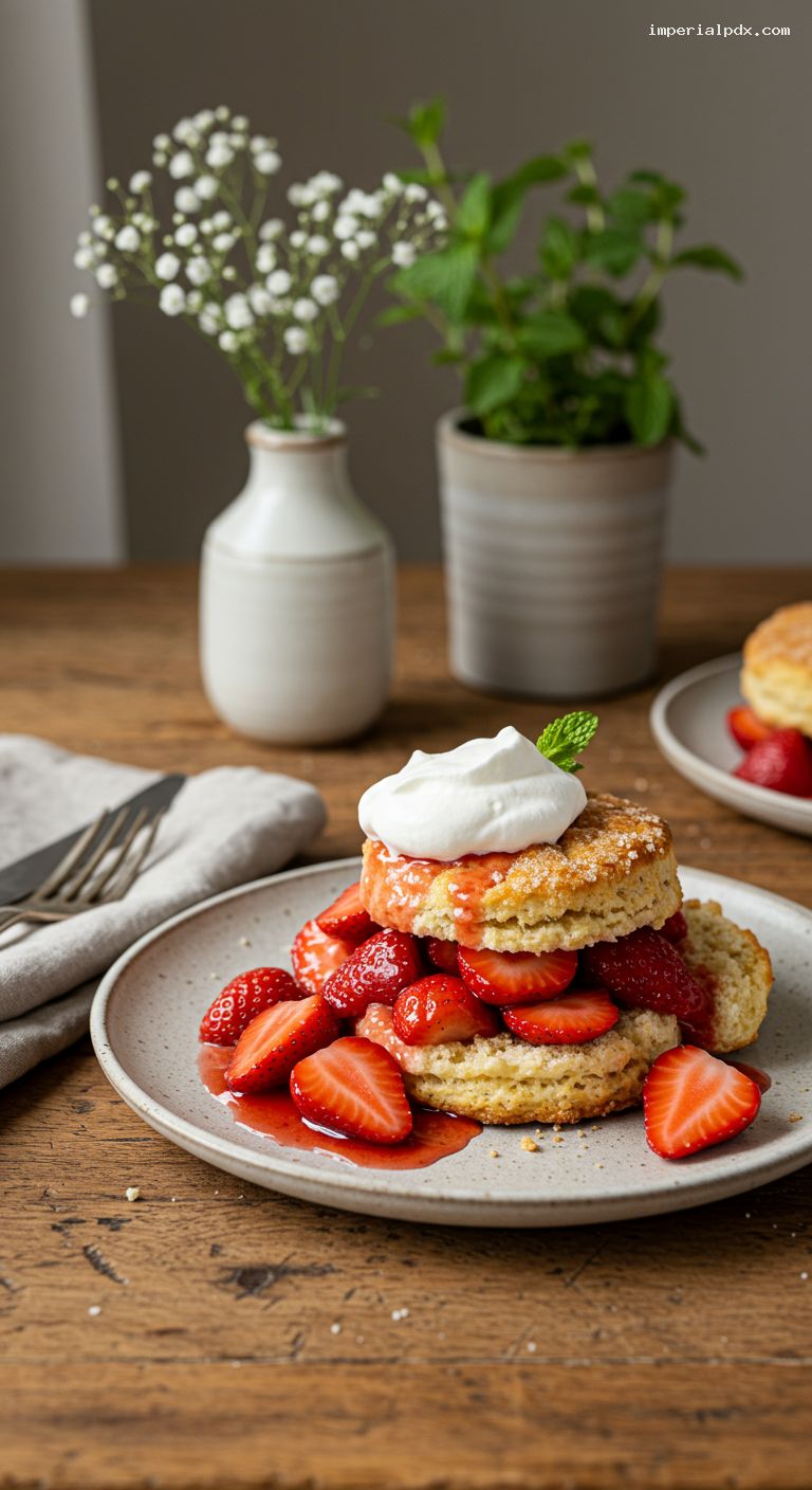 Split each warm biscuit with a serrated knife. Spoon a generous amount of syrupy strawberries onto the bottom half, letting the juices soak in. Top with a cloud of whipped cream and cap with the biscuit top. Spoon a little extra strawberry syrup over the top. Garnish with mint if using. Serve immediately for the best texture.