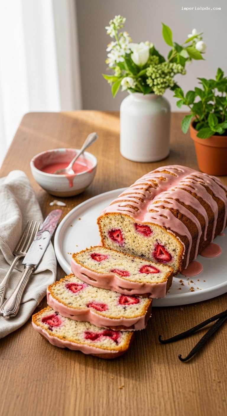 Cool the loaf in the pan for 10 minutes. Lift out using the parchment and transfer to a wire rack to cool completely, 45–60 minutes. For the glaze, whisk powdered sugar with 2 tbsp strawberry puree, vanilla, lemon juice, and a pinch of salt. Add up to 1 additional tbsp puree for a thin, pourable glaze. Spoon a light layer over the cooled loaf, letting it drip down the sides. Let set 10–15 minutes before slicing with a serrated knife.